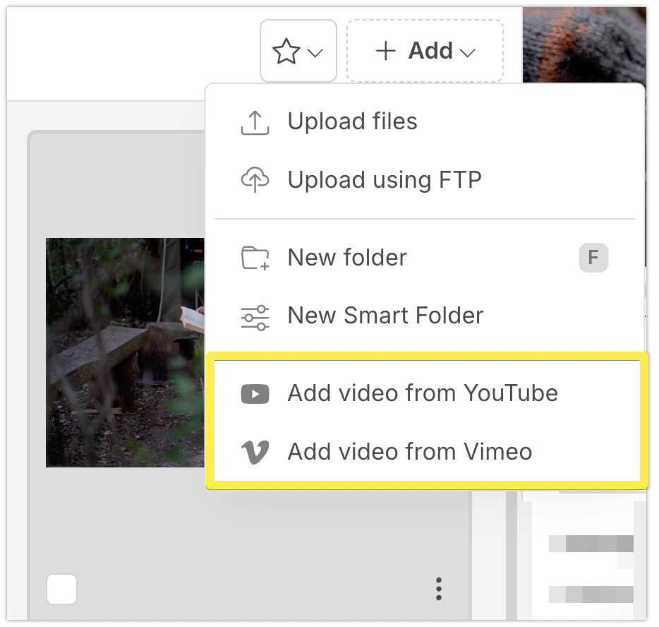 Under the Add button, you can choose to add a video from an external source. The video file appears like other files in Mediaflow. You can watch the video and view information about it, but you won't be able to download it. This is because it is stored with YouTube or Vimeo, which is also why their players are used instead of the Mediaflow video player.