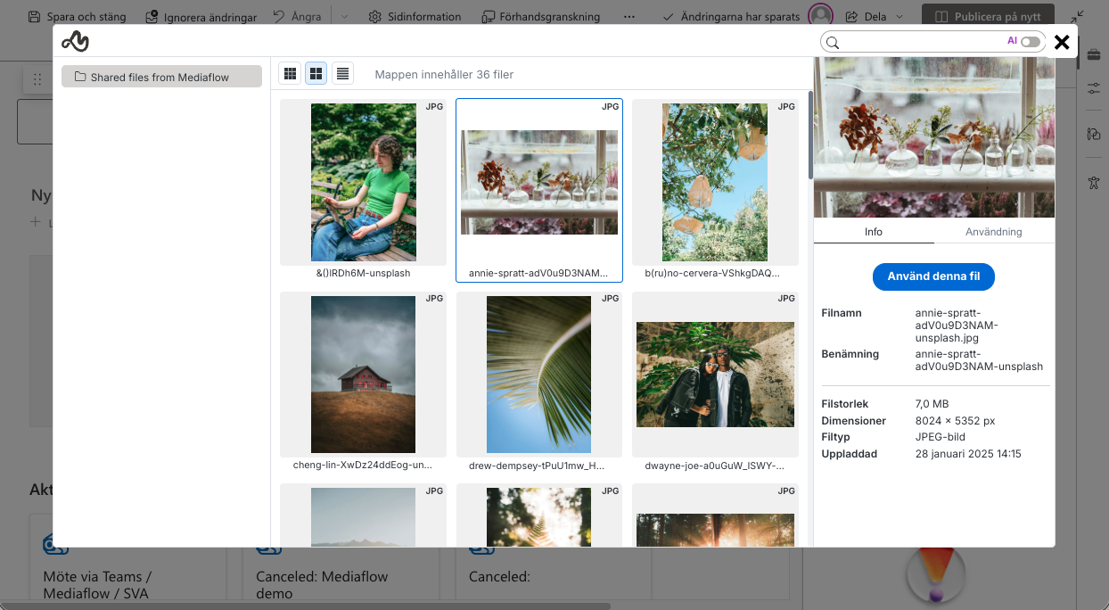 The SharePoint integration enables publishing of images from Mediaflow directly in SharePoint's editing modes. This is an excellent way for web editors to always have access to files that are GDPR-compliant and have the correct alt texts.