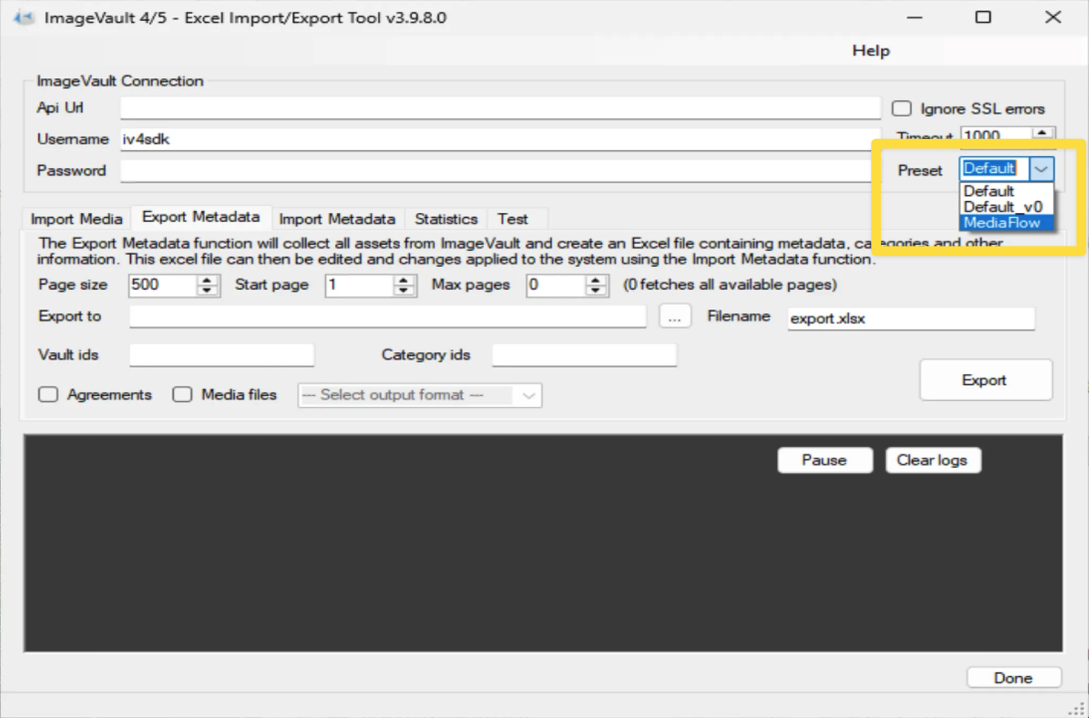 Select the correct preset. This preset ensures that all files are placed side-by-side in the upload folder File names are prefixed with the Imagevault media ID (required for Mediaflow).