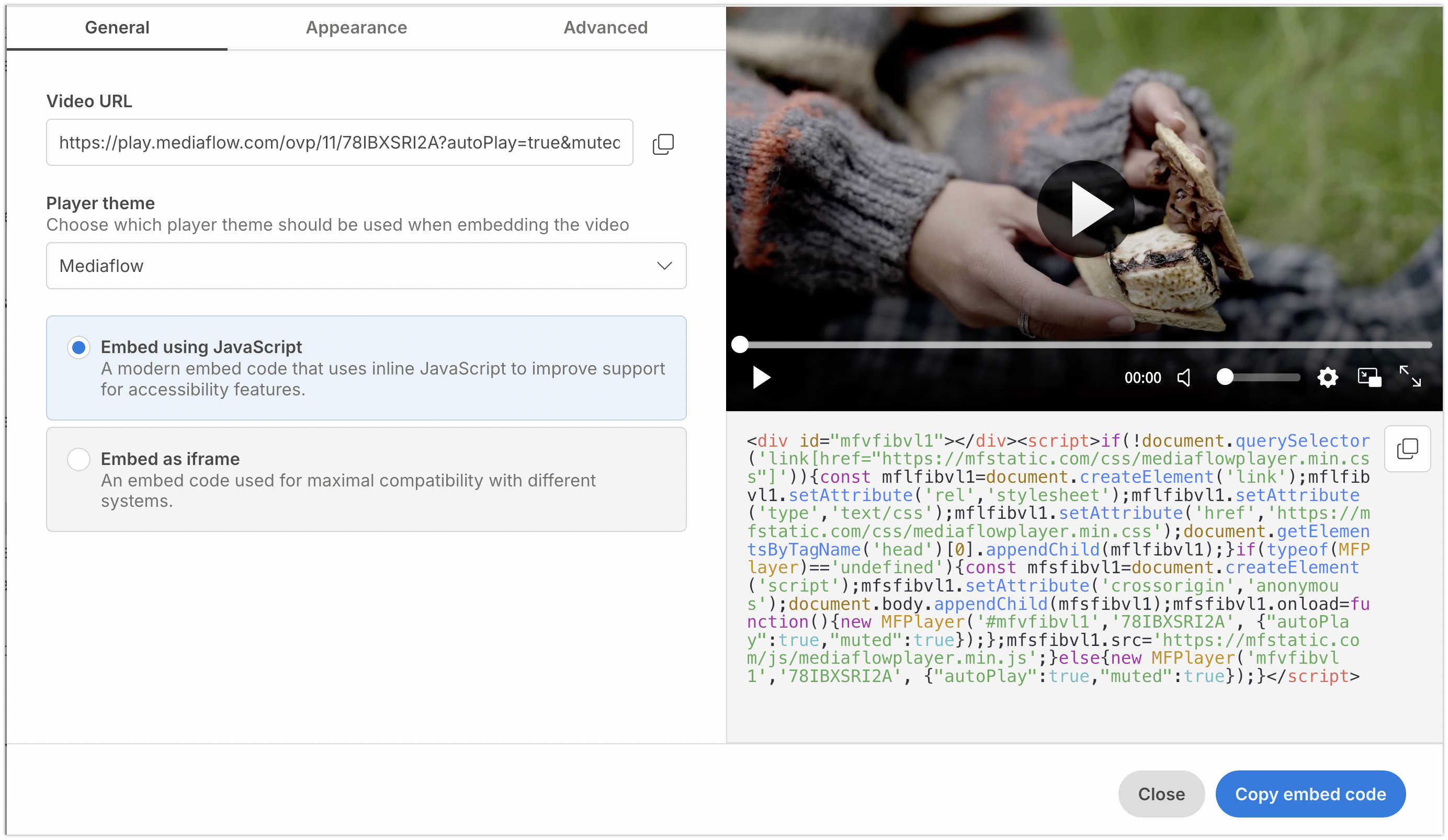 Om ni använder inbäddningskod rekommenderar vi att ni bäddar in med JavaScript då det fungerar bättre än iframe vad det gäller tillgänglighetsanpassning. Under de avancerade inställningarna kan ni göra inställningar för att anpassa koden gällande autospelning, videotitel, playknapp, spelarspråk m.m.