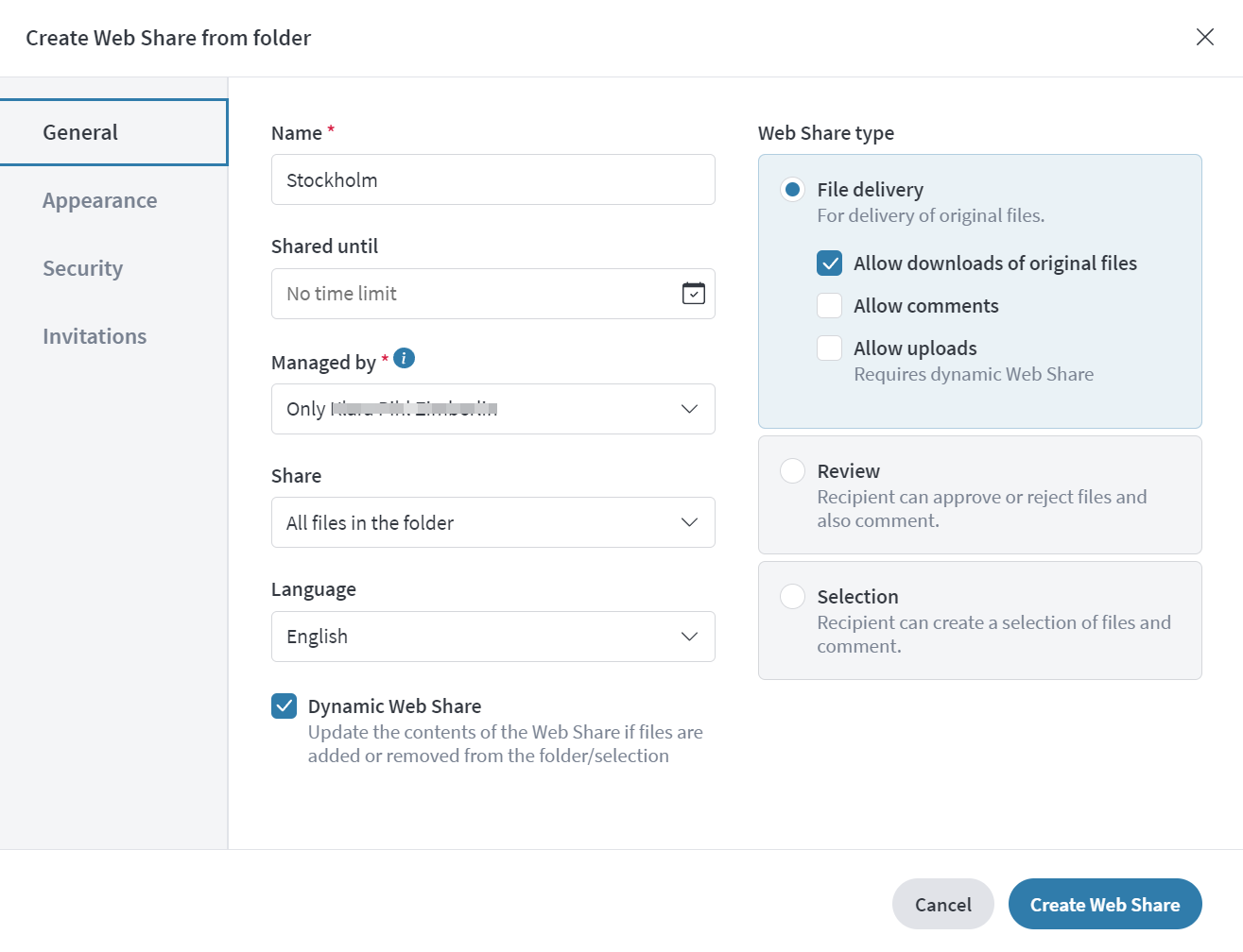 I första läget under fliken Allmänt [General] väljer du vilken typ av webblänk du vill skapa utifrån det syfte webblänken ska uppfylla. Ofta handlar det om en leverans av filer dvs att man vill dela med sig av eller ta emot filer [File delivery]. Men du kan även välja att låta mottagaren hjälpa till att godkänna [Review] eller välja ut filer genom att kryssa i olika val [Selection]. När du väljer typ av webblänk anpassas valen av övriga fält. Du väljer sedan namn på webblänken, om du vill ha ett slutdatum för den, vilka som ska kunna hantera den osv. Om du har skapat en webblänken från en mapp eller ett urval är det förvalt att dessa automatiskt uppdateras om man lägger till eller tar bort i filer i urvalet/mappen. Dessa inställningar räcker för att snabbt skapa en webblänk, alternativt kan du göra fler anpassningar under övriga flikar.