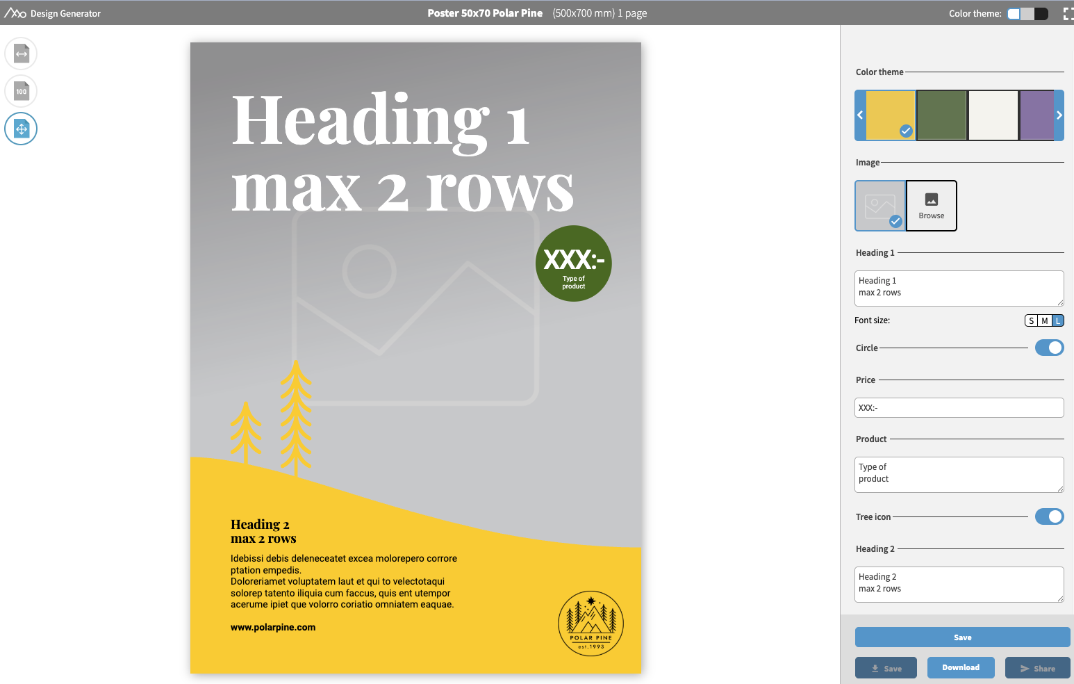 Så snart du gör en ändring i en designmall, tänds knappen Spara och du kan spara ett designdokument. En unik länk skapas då, vilket gör att du kan återgå till ditt designdokument senare.