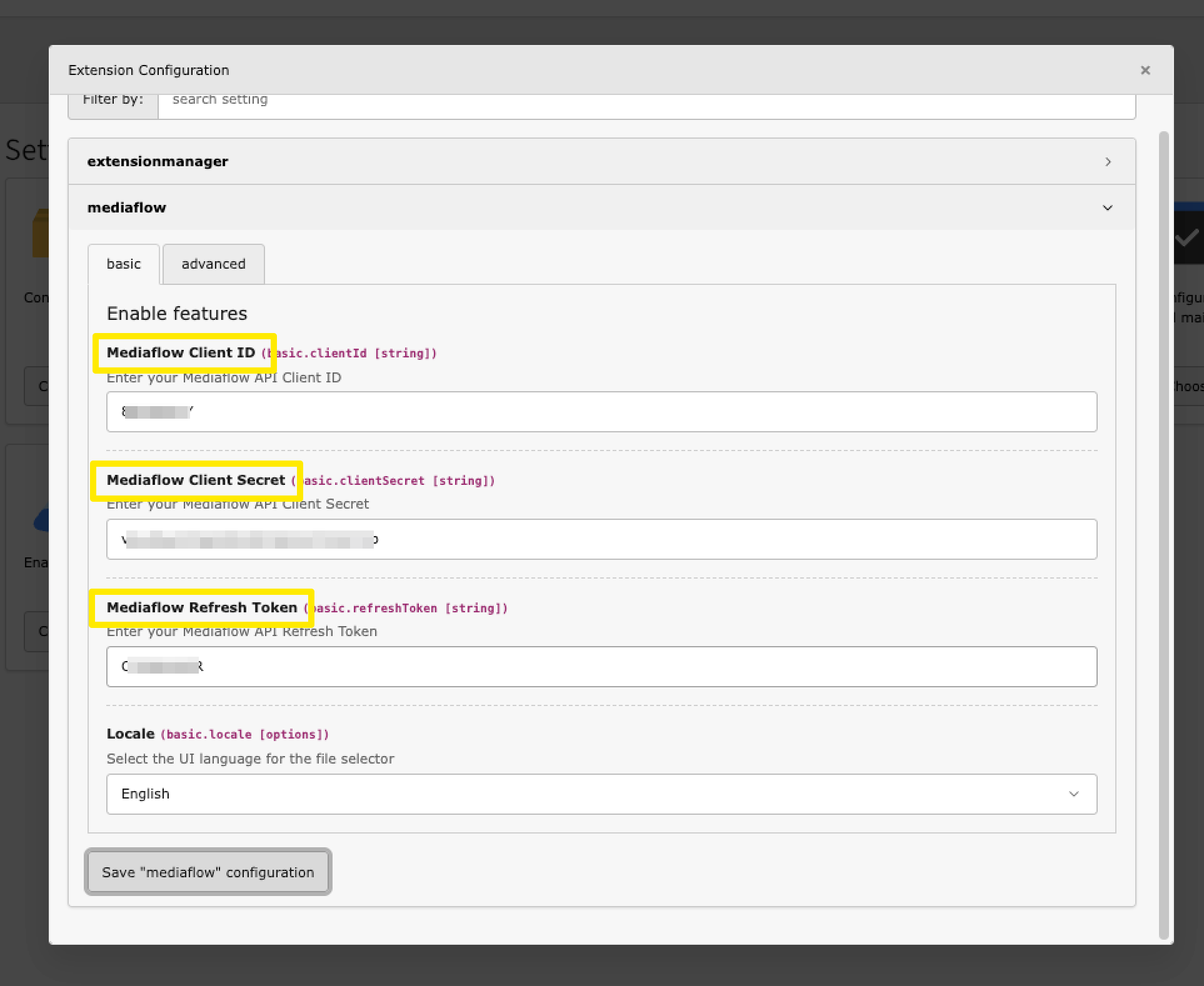- Sök upp Mediaflow och kopiera in era värden för Client ID, Client Secret och Refresh token i fälten för dessa uppgifter.