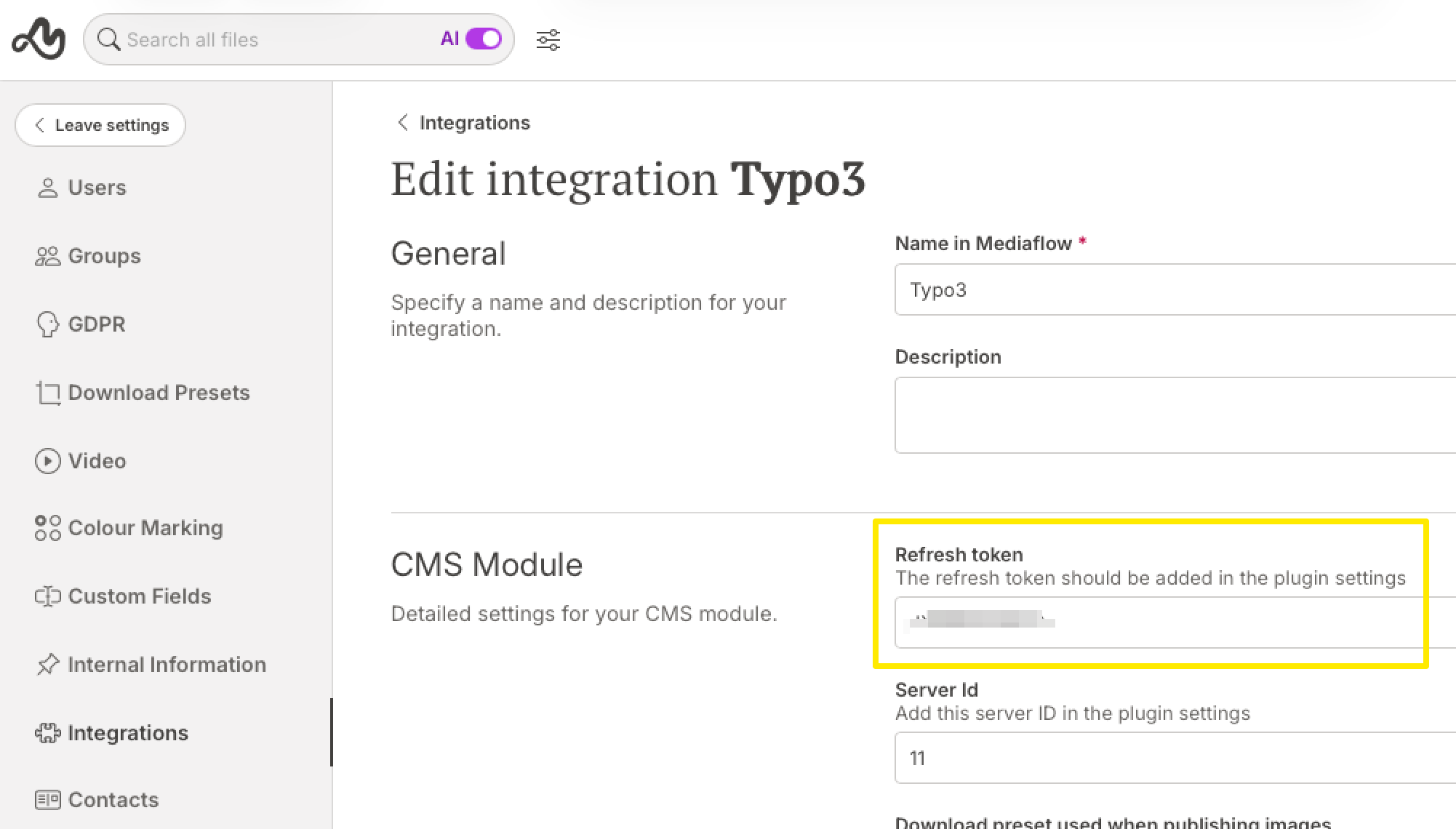 Refresh token (ServerKey) hittar du i ert Mediaflow-konto under: